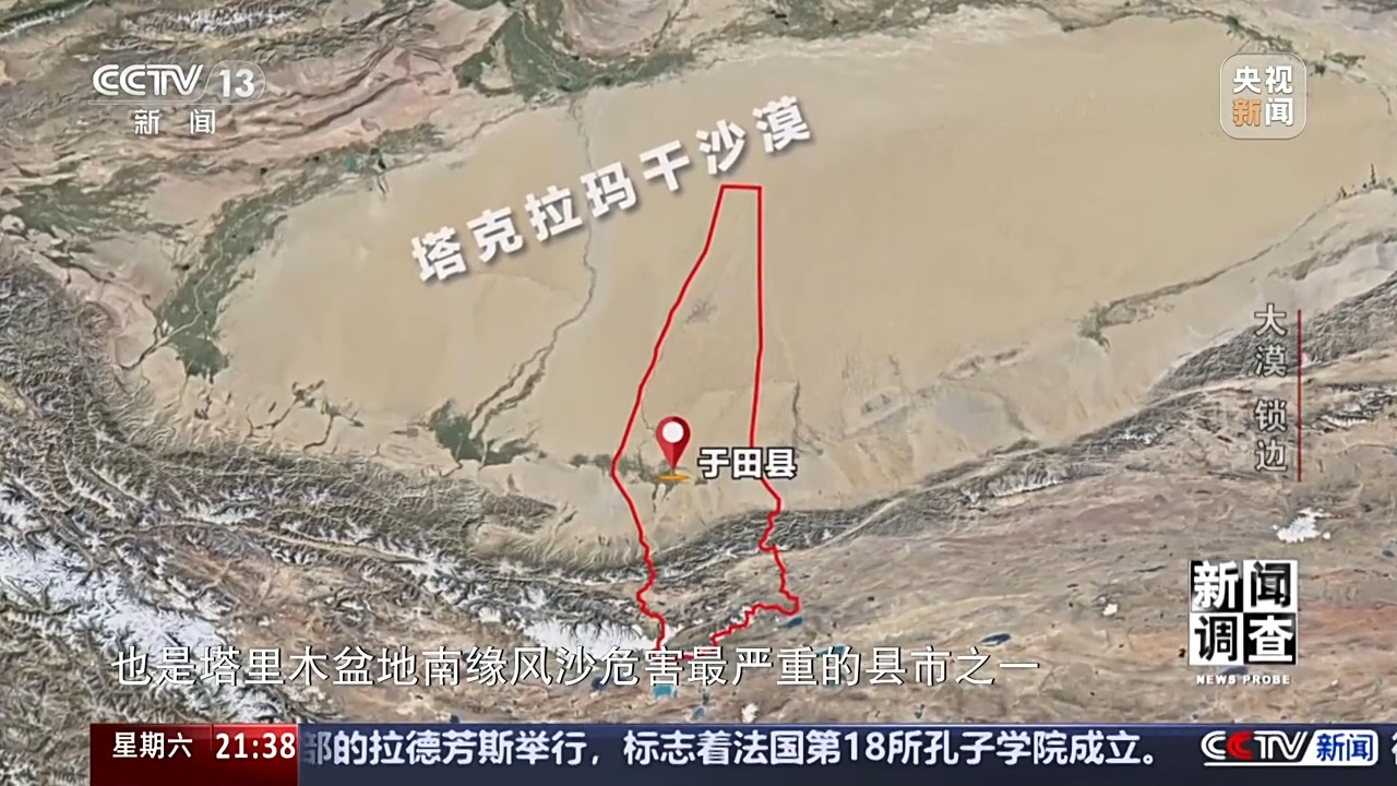 中國科學院新疆生態(tài)與地理研究所荒漠與綠洲生態(tài)國家重點實驗室主任 陳亞寧:整個塔克拉瑪干沙漠邊緣的周長3046公里,那其中有285公里空白區(qū)需要鎖邊。在這285公里中,和田地區(qū)就有220公里,那為什么這么多年防沙治沙生態(tài)建設都沒有做完,為什么還剩下這285公里呢?因為這285公里的空白區(qū)大多位于這個風線、風口、風沙路徑區(qū),治沙難度非常大,而且水資源也匱乏,所以在這一塊地區(qū)這個鎖邊難度是非常之大的。