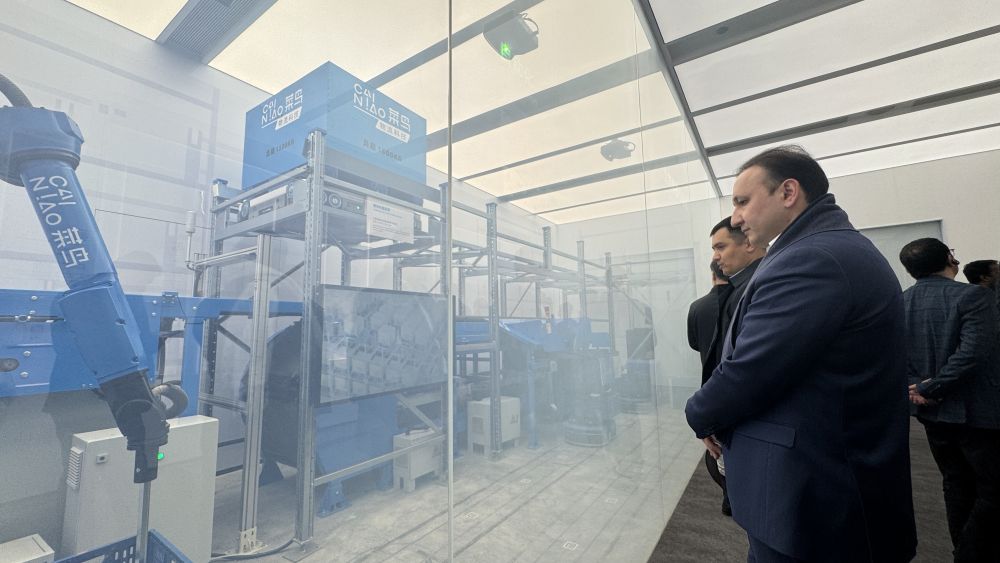 12月13日,協(xié)調(diào)員參觀菜鳥集團的智能物流設(shè)備。新華社記者 段菁菁 攝
