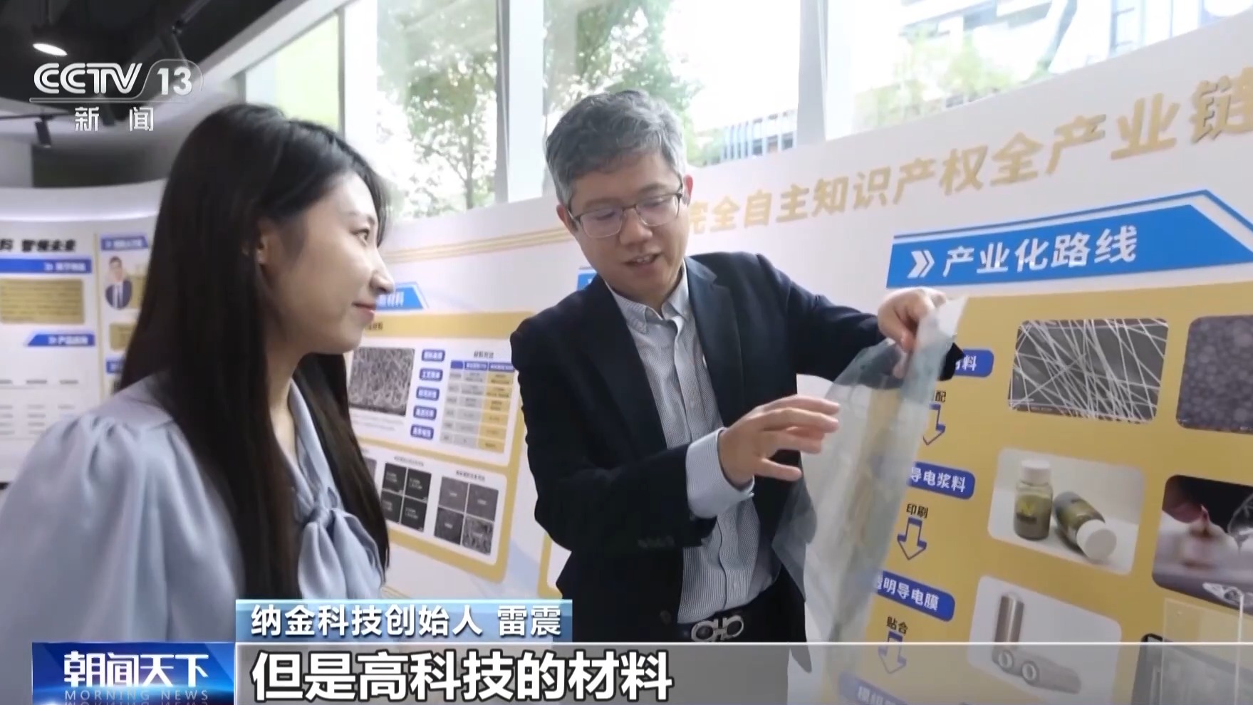 納金科技創(chuàng)始人 雷震:平平無奇的一張膜,但是高科技的材料已經(jīng)富含在里面了,這些位置印刷了一層納米銀線的材料,直徑大約相當(dāng)于人頭發(fā)絲的萬分之一,柔性、耐彎折、靈敏度高、電阻更低、功耗更小,成本還能比傳統(tǒng)的薄膜降低30%左右,所有的材料和印刷工藝都是我們自己的技術(shù),完全自主可控。