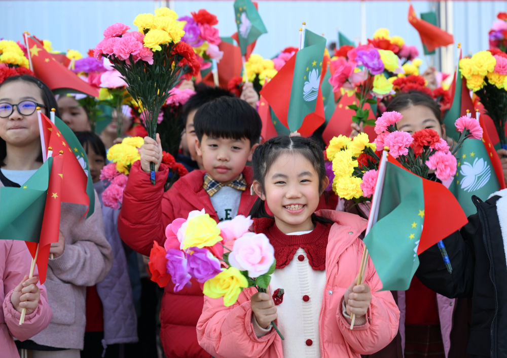 在澳門國際機場,澳門警察樂隊奏響熱情洋溢的歡迎曲,舞龍舞獅表演喜氣歡騰。數(shù)百名澳門青少年和各界群眾代表揮動國旗、特別行政區(qū)區(qū)旗和鮮花,表達(dá)熱烈的歡迎。