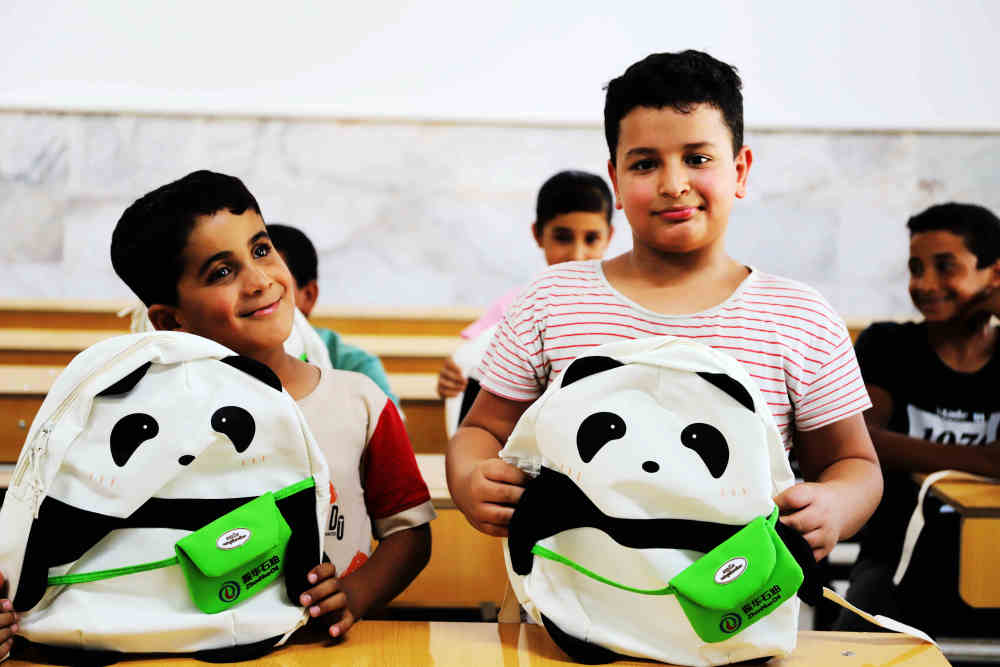 7月11日,在伊拉克巴格達(dá),即將搬遷至振華希望學(xué)校就讀的當(dāng)?shù)貙W(xué)生收到振華石油贈送的書包。新華社發(fā)