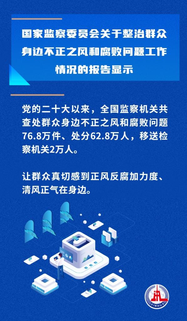 黨的二十大以來,全國(guó)監(jiān)察機(jī)關(guān)查處群眾身邊不正之風(fēng)和腐敗問題76.8萬件、處分62.8萬人,移送檢察機(jī)關(guān)2萬人……