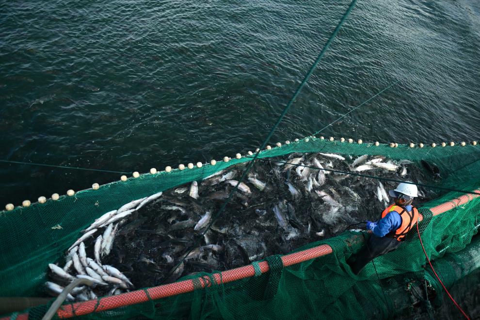 “傳統(tǒng)吊網(wǎng)捕撈會(huì)讓虹鱒魚(yú)體內(nèi)因緊張產(chǎn)生更多肌酸。我們現(xiàn)在用吸魚(yú)泵連魚(yú)帶水直接送入車(chē)間,保證魚(yú)肉質(zhì)鮮嫩。”他說(shuō)。