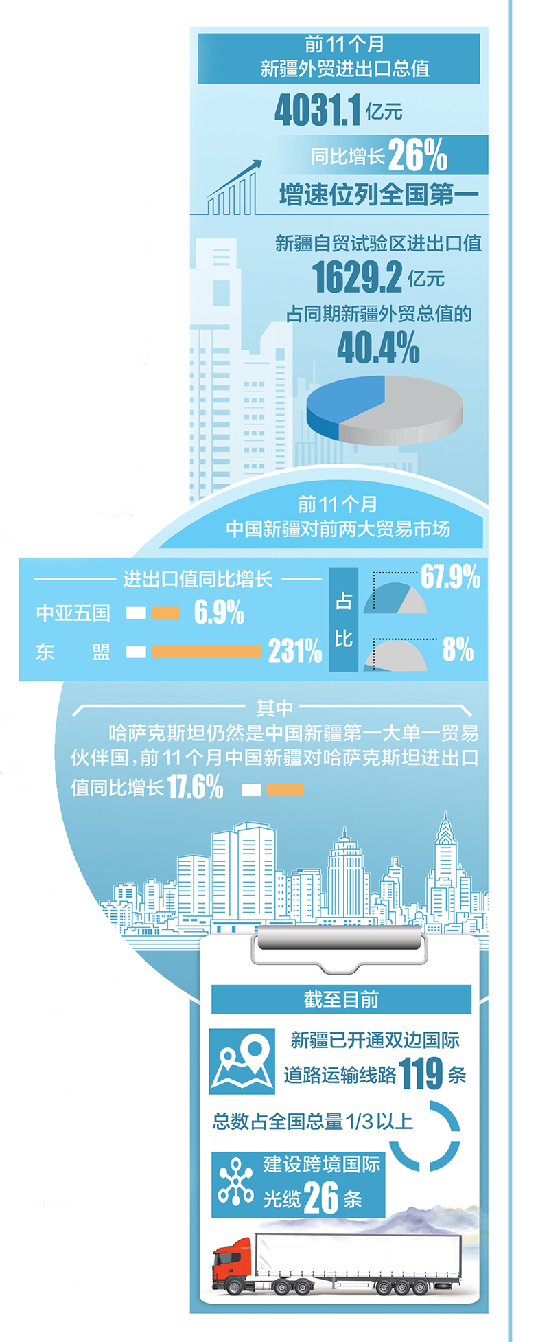 新疆自貿(mào)試驗區(qū)賦能效應(yīng)持續(xù)顯現(xiàn)。烏魯木齊海關(guān)數(shù)據(jù)顯示,前11個月,新疆自貿(mào)試驗區(qū)進(jìn)出口值1629.2億元,占同期新疆外貿(mào)總值的40.4%。