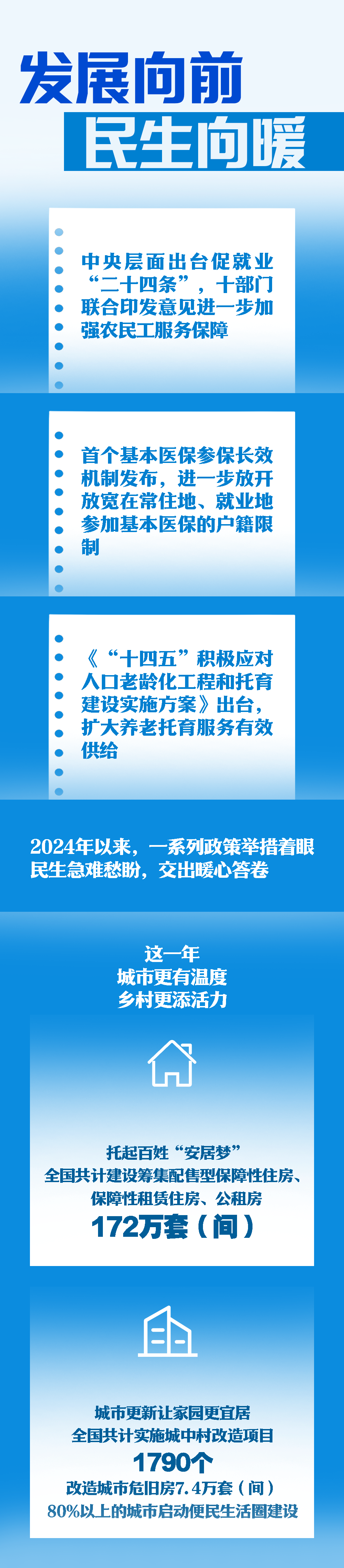 2024年以來,從中央層面出臺促就業(yè)“二十四條”,到首個基本醫(yī)保參保長效機制發(fā)布,再到聚焦“一老一小”領域擴大養(yǎng)老托育服務有效供給,一系列政策舉措著眼民生急難愁盼,書寫暖心答卷。