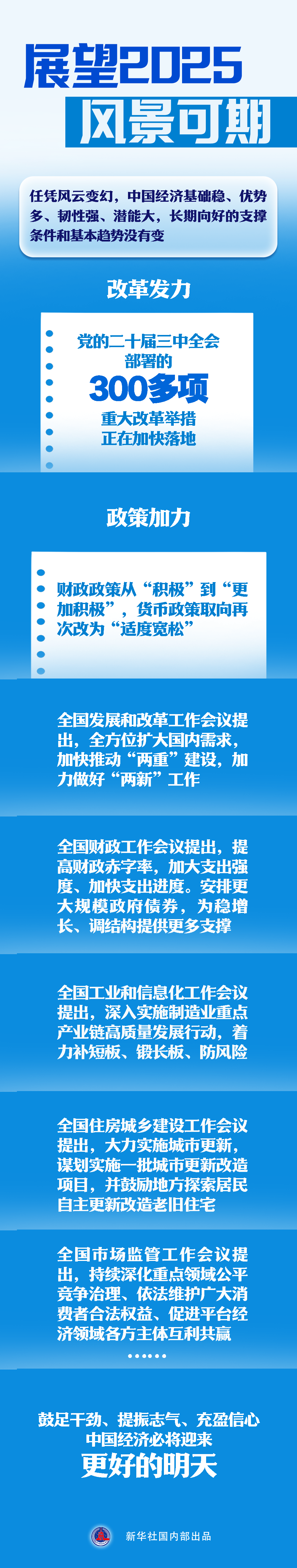 前進道路上,我們還將在風高浪急時爬坡過坎,在驚濤駭浪中涉灘闖關,更將在改革創(chuàng)新、團結奮斗中創(chuàng)造萬千氣象。鼓足干勁、提振志氣、充盈信心,中國經(jīng)濟必將迎來更好的明天。