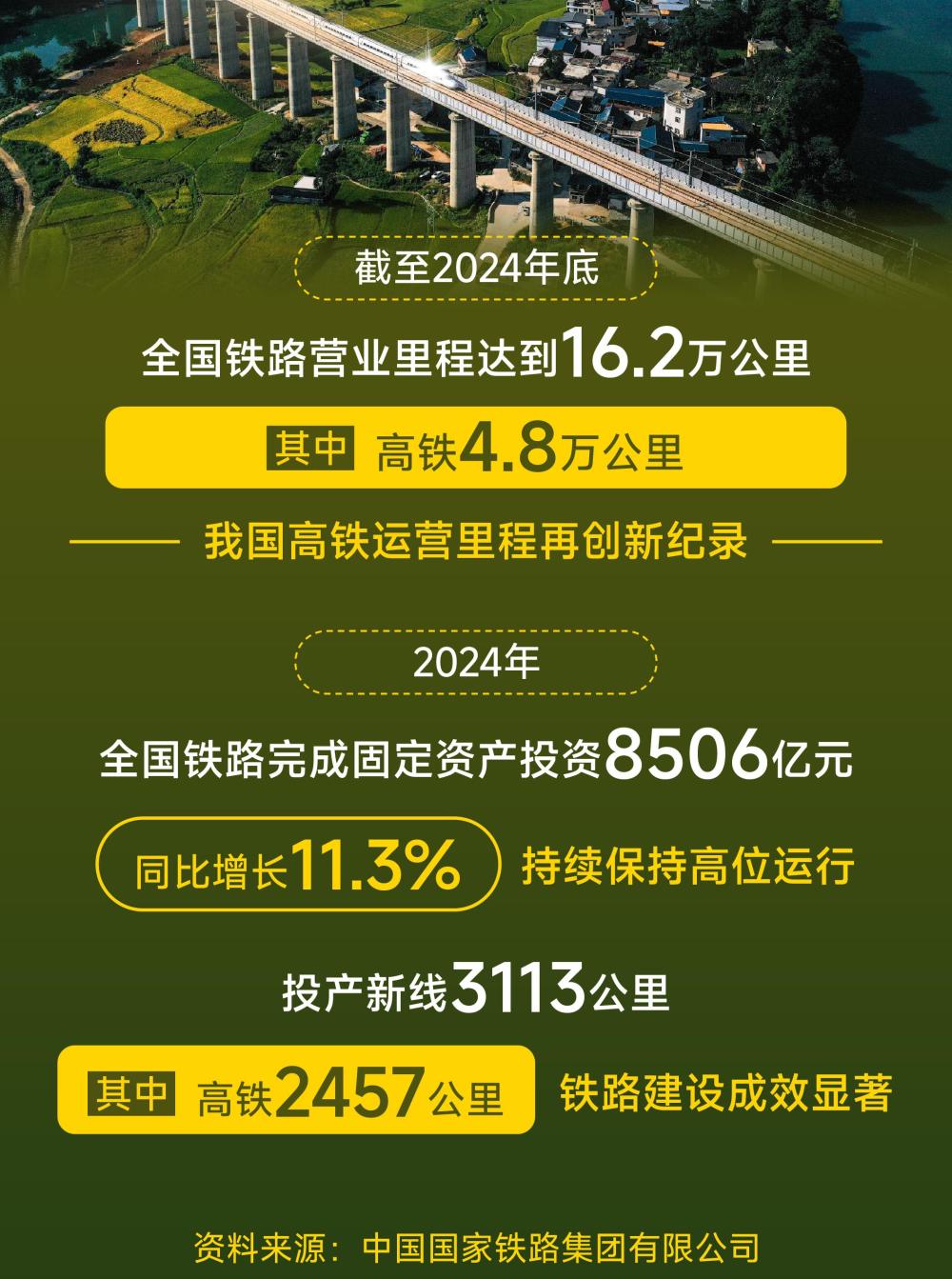 截至2024年底,全國(guó)鐵路營(yíng)業(yè)里程達(dá)到16.2萬(wàn)公里,其中高鐵4.8萬(wàn)公里,我國(guó)高鐵運(yùn)營(yíng)里程再創(chuàng)新紀(jì)錄。