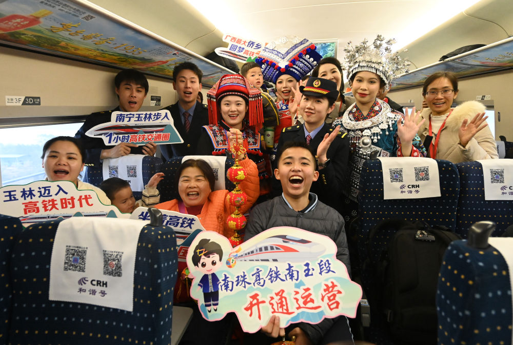 2024年12月30日,工作人員和乘客在廣西玉林開(kāi)往南寧的列車上合影。