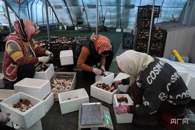 工人們將剛剛采收下來的羊肚菌剪根、裝箱(央廣網發(fā) 畢樂陶 攝)