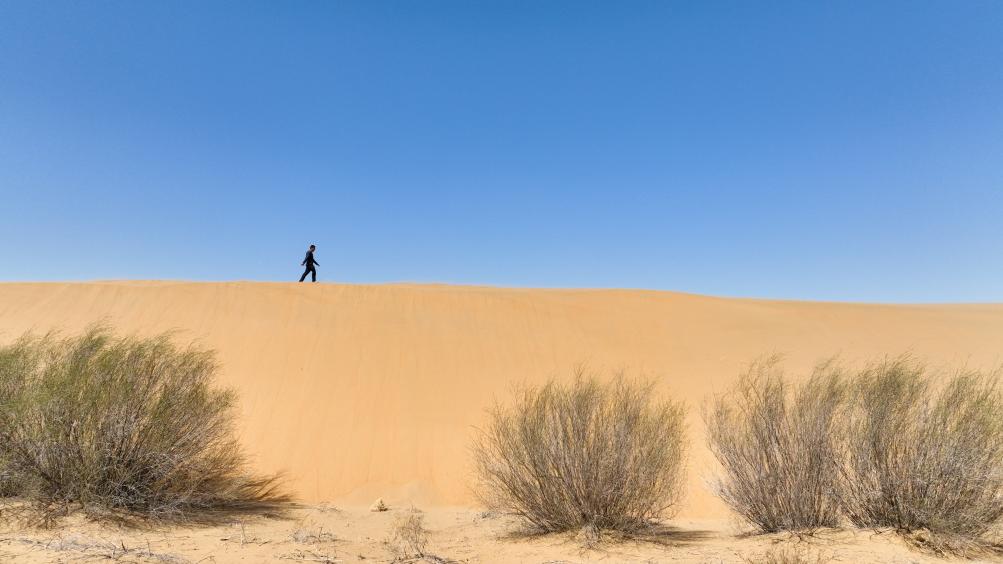 2024年4月11日,一名治沙人行走在達(dá)拉特旗境內(nèi)的庫布其沙漠里(無人機(jī)照片)。新華社記者 貝赫 攝