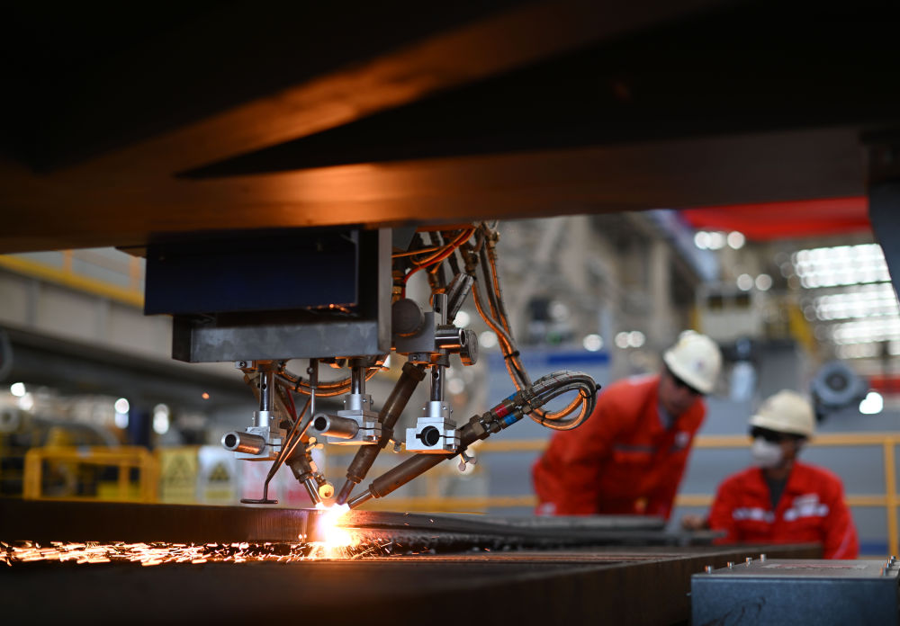 工作人員在海油工程天津智能制造基地制管作業(yè)車間調(diào)試數(shù)控切板機(2024年10月30日攝)。 新華社記者 趙子碩 攝