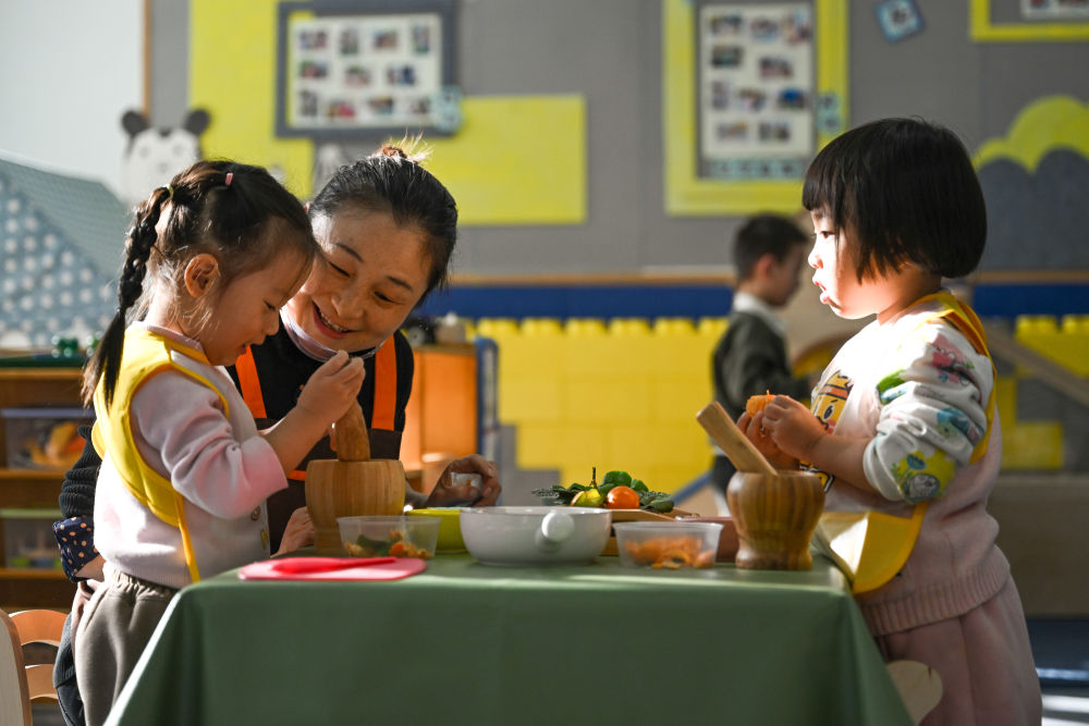 在青海省西寧市城中區(qū)一家托育中心,老師帶孩子們體驗勞動課程(2024年12月12日攝)。 新華社記者 張龍 攝