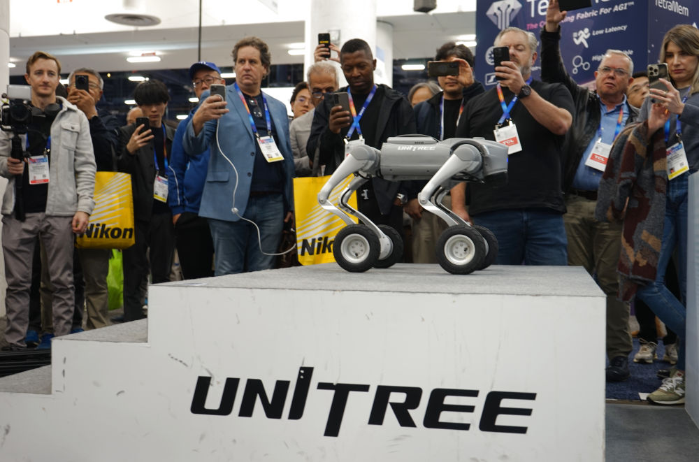 1月8日,在美國拉斯維加斯,人們在中國企業(yè)宇樹科技的展區(qū)觀看機(jī)器狗展示。新華社發(fā)(曾慧攝)