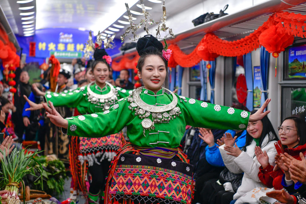 新鮮的農(nóng)產(chǎn)品、喜慶的車廂、特色的民族歌舞、精美的非遺展示……1月18日,2025年全國鄉(xiāng)村“村晚”示范展示活動暨“村火車上的村T村晚”啟動儀式,在貴陽開往玉屏的5640次“慢火車”上舉行。
