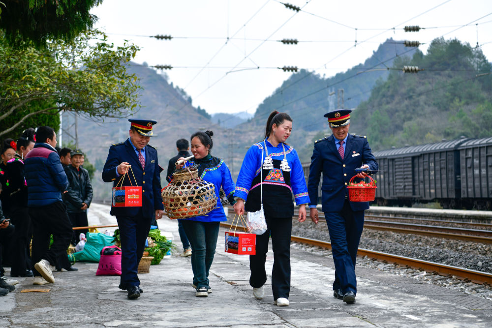 1月18日,在滬昆鐵路六個雞火車站,鐵路工作人員與村民交流當(dāng)天售賣的農(nóng)產(chǎn)品情況。新華社記者 楊文斌 攝
