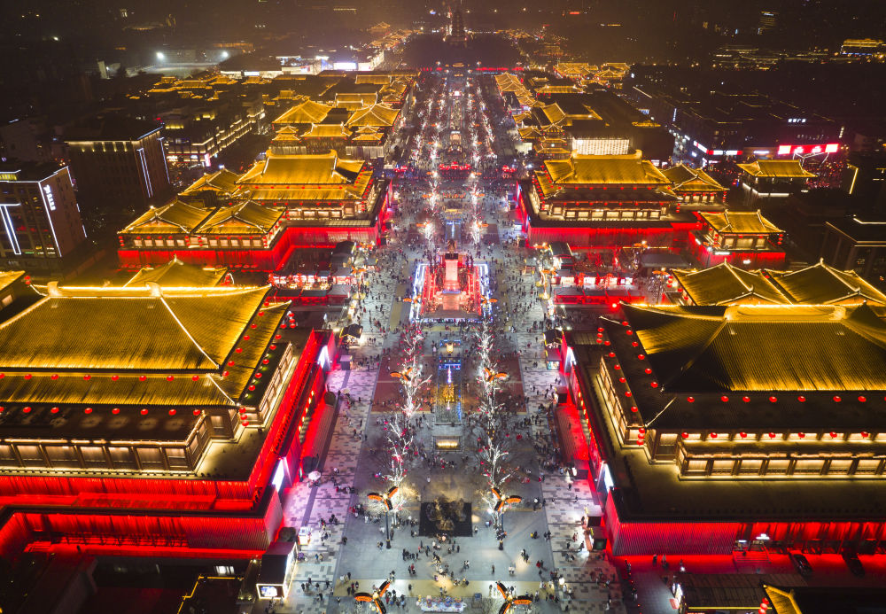 西安大唐不夜城景色(1月22日攝,無(wú)人機(jī)照片)。新華社記者 邵瑞 攝