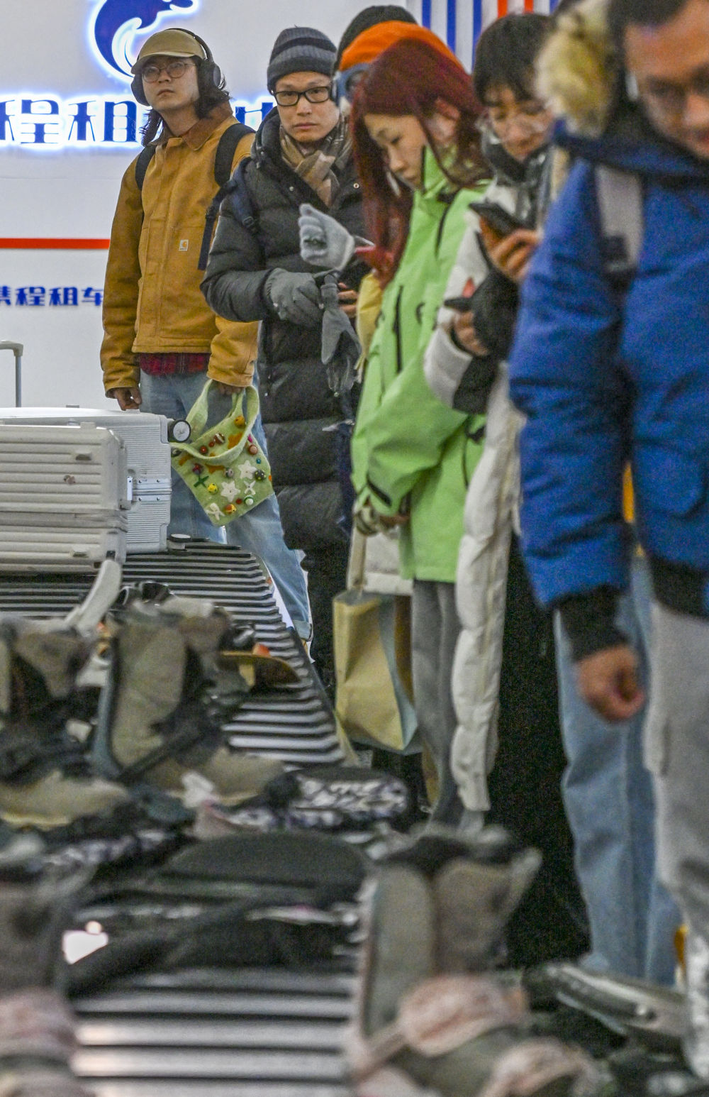 1月25日,在阿勒泰雪都機場行李提取大廳,游客等待提取行李。
