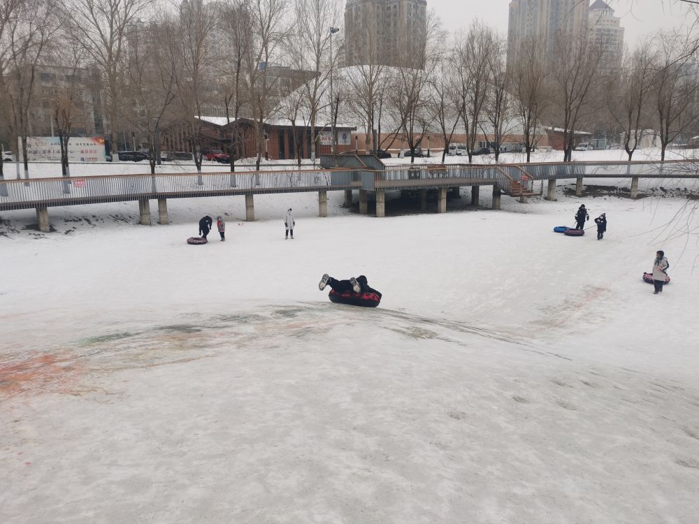 在哈爾濱湘江公園,28日一早,10歲的黃梓天就和爸爸一起來玩雪圈。這處公園里形成的自然雪坡,每年冬季都成為市民滑雪圈的好去處?!霸缟虾⒆右獊恚蛶е^來玩一會(huì),也是一種過年的方式?!秉S梓天的父親黃文說。
