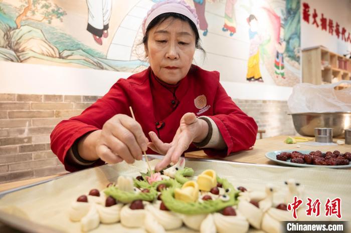 1月10日,面塑手藝人續(xù)愛(ài)花制作“蛇盤(pán)兔棗山面塑”?!≈行律缬浾?韋亮 攝