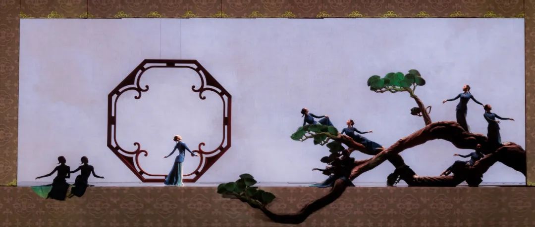 宋畫(huà)以筆觸細(xì)膩、意境深遠(yuǎn)著稱(chēng),尤其是花鳥(niǎo)畫(huà),在宋朝迎來(lái)了獨(dú)樹(shù)一幟的黃金時(shí)代。編導(dǎo)參考大量宋畫(huà)作品,尤其從南宋畫(huà)家林椿的《十全報(bào)喜圖》中獲取靈感,將宋畫(huà)的美學(xué)哲學(xué)完美地轉(zhuǎn)譯為舞蹈中的構(gòu)圖邏輯。舞臺(tái)背景是紋理清晰的畫(huà)布,幕簾和升降地屏搭建出裱框,整個(gè)舞臺(tái)如同從水平面上翻轉(zhuǎn)而立,變成巨幅的國(guó)畫(huà)卷軸。