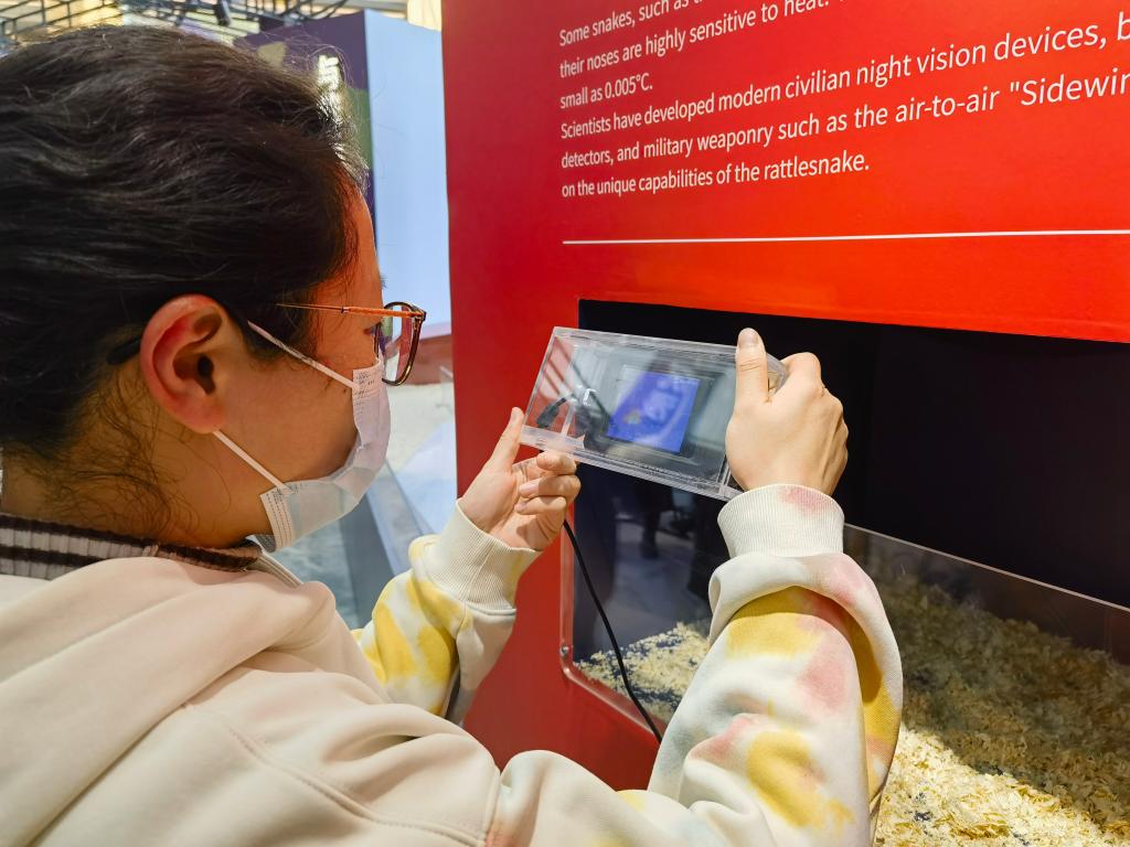 游客在上海自然博物館里通過紅外互動裝置了解蛇如何“鎖定”獵物。新華社記者 陳愛平 攝