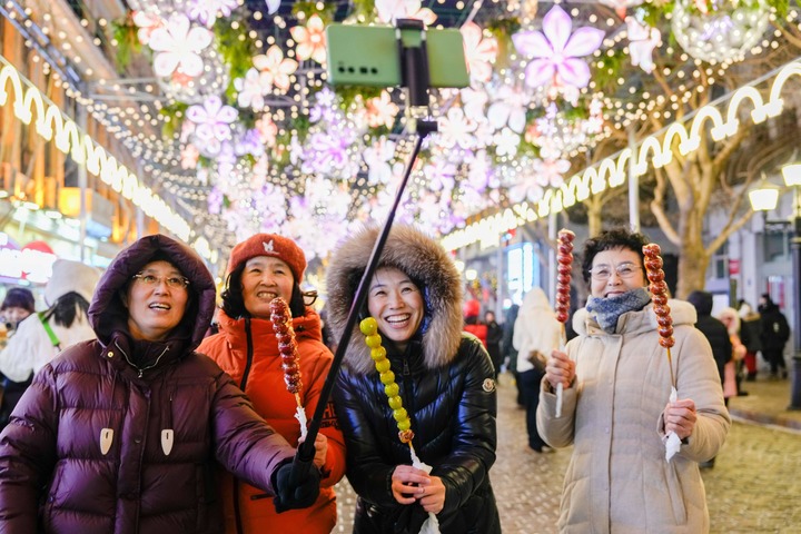 2025年1月30日,游客在哈爾濱中央大街上手持糖葫蘆自拍。新華社記者 王建威 攝