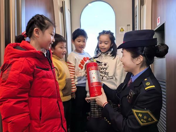 春運期間,南昌客運段組織開展安全乘車小課堂。圖為G1584次列車乘務員在給小朋友講解列車消防設備設施的使用。王夢婧子/攝