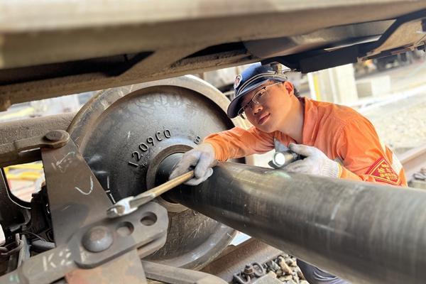 1時30分,作業(yè)人員攜帶道尺、檢查錘、油壺等材料工具,向站場西邊進發(fā),點點頭燈猶如點點螢光,緩緩向前方移動。10分鐘后,左自強抵達14號道岔,他彎下腰,將道尺卡在鋼軌間讀取數(shù)值?!?.5、0.4、0.5……”他邊檢查邊記錄,不放過一處問題隱患。在一顆松動螺栓處,左自強先用手旋緊,再用扳手緊固,最后雙手用力下壓扳手,直至螺栓紋絲不動?!耙活w螺栓松動,就可能帶來重大安全隱患。再細小的事情我們也要認真仔細地做好?!弊笞詮娬f。