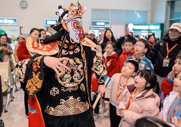 1月30日,Y987次“非遺主題”熊貓專列出發(fā)前,變臉演員正在與小游客互動。孟寬/攝