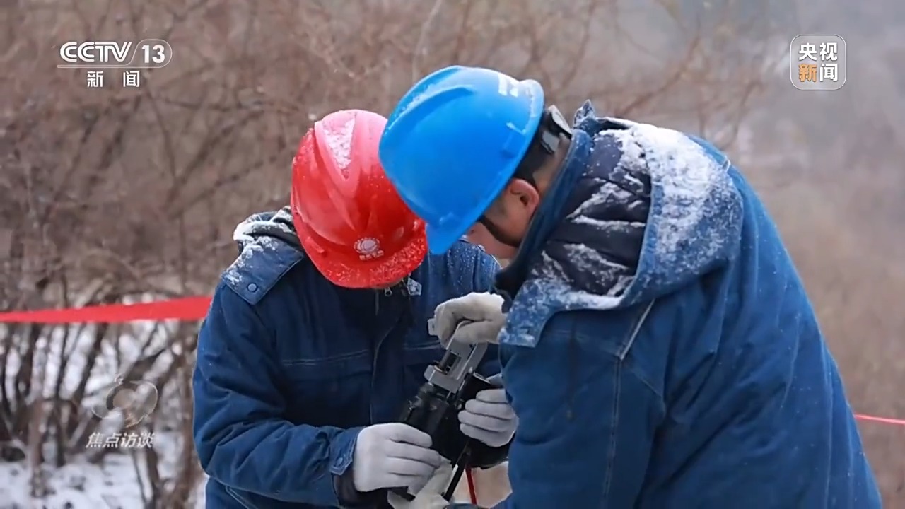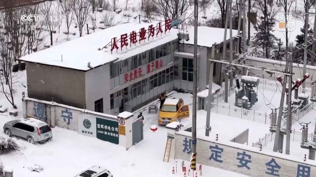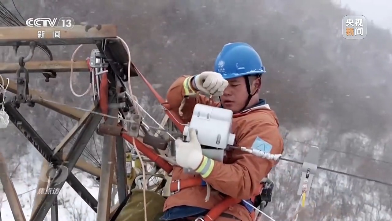 伴著2025春節(jié)的來臨,一場降雪為秦嶺披上銀裝。國網(wǎng)寶雞供電公司110千伏秦嶺融冰變電站,一臺安裝在輸電鐵塔上的監(jiān)測設(shè)備發(fā)生故障,工作人員正在商討對策。