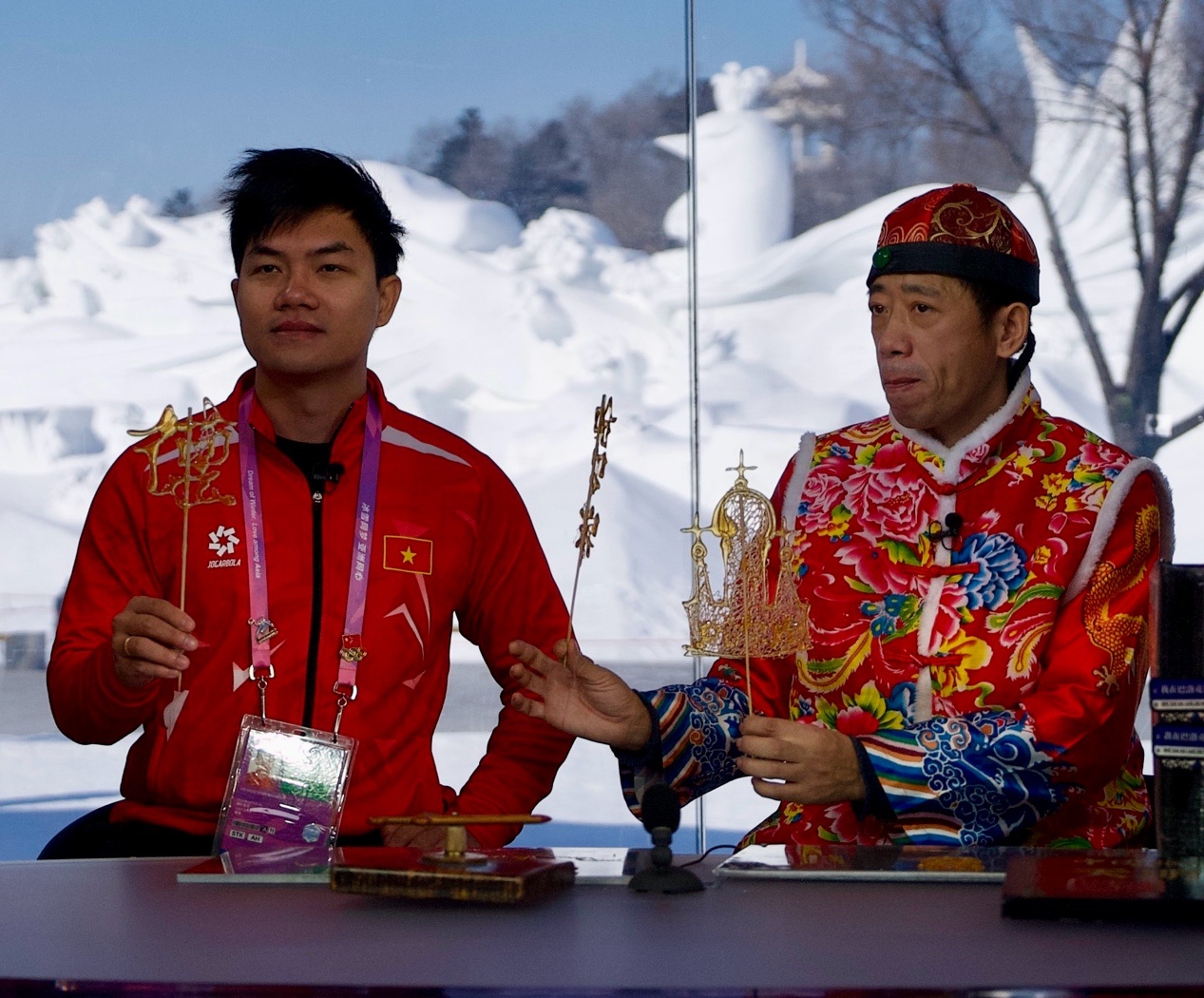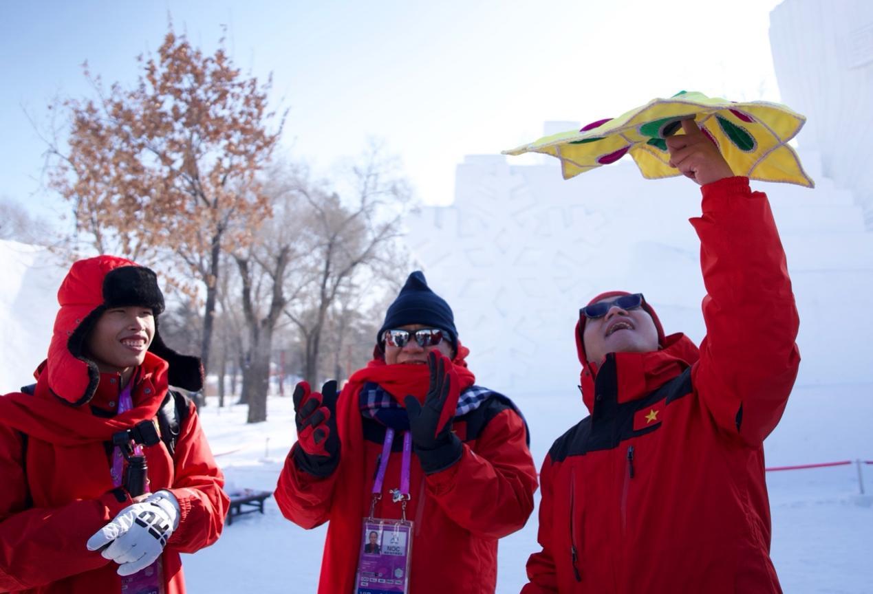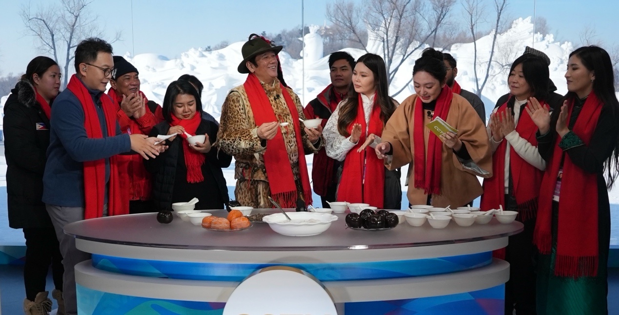 來自蒙古國、泰國、菲律賓、越南、印度、尼泊爾等國的近20位運動員、體育代表團(tuán)官員和媒體人,在賽場上比拼之后,歡聚在哈爾濱太陽島雪博會中央廣播電視總臺的演播室,在冰天雪地中共慶新春。