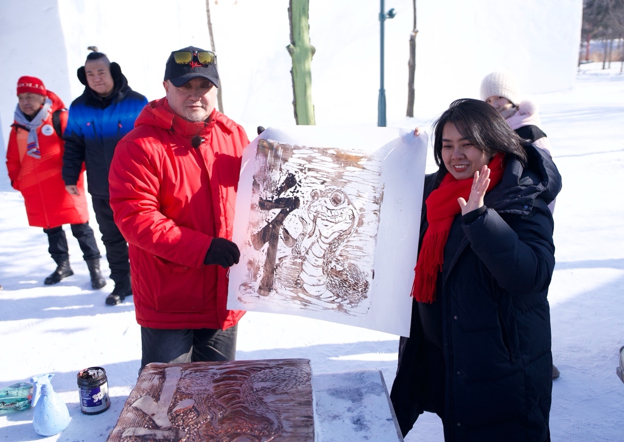 泰國駐華大使館二等秘書王安安在黑龍江省藝術(shù)研究院冰版畫研究院副院長盛琰的指導(dǎo)下,制作出冰版畫《畫蛇添福》,用蛇的形狀和漢字的偏旁部首組合雕刻出漢字“福”并拓印出來,寄托對中國農(nóng)歷蛇年的祝福。