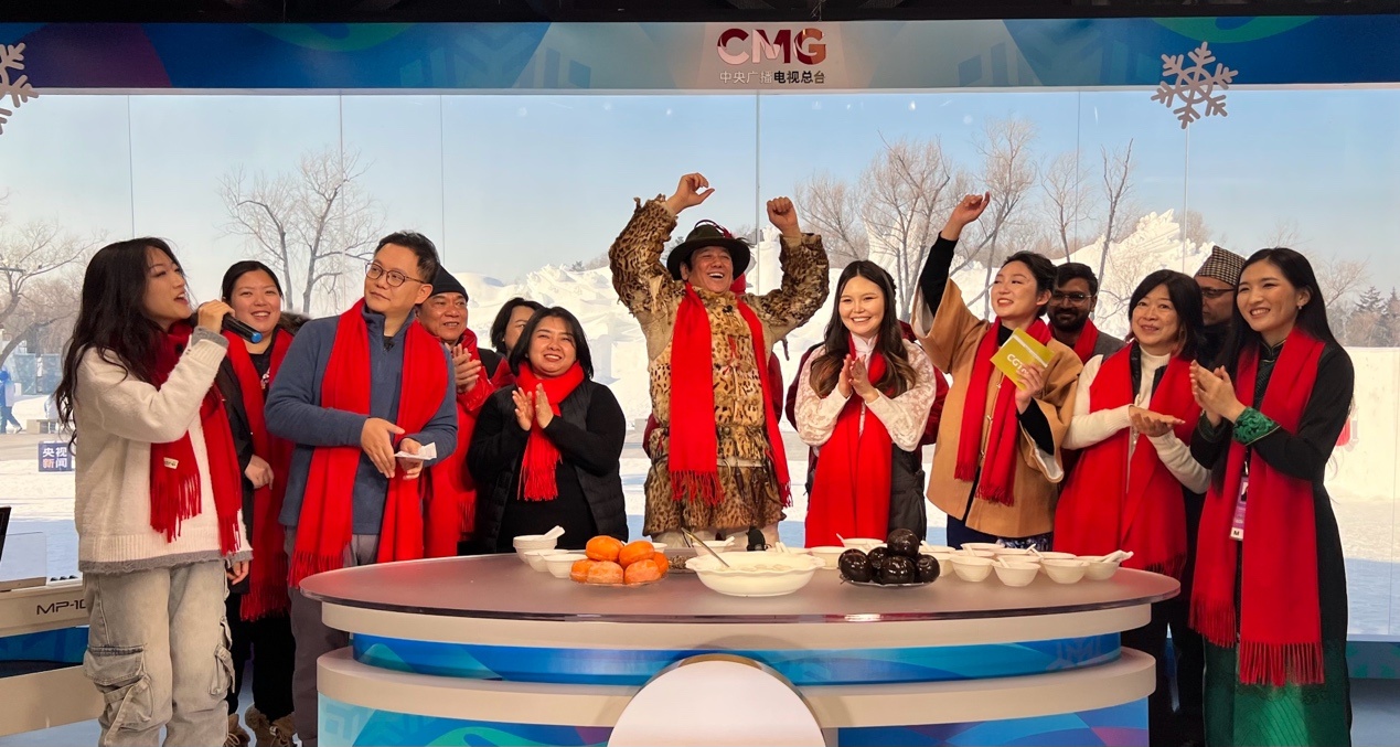 參加“當(dāng)亞冬會遇上‘非遺年’”人文交流活動的中外嘉賓在哈爾濱太陽島雪博會CMG演播室同慶新春