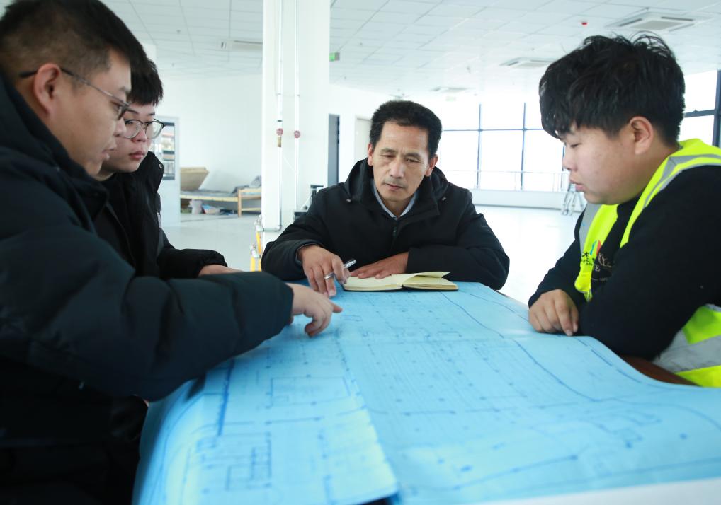 在項目部內(nèi),周培(右二)和工作人員對工程操作注意事項進行研討。(受訪者供圖)