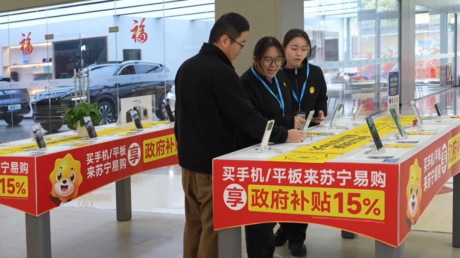 消費(fèi)者在蘇寧易購廣西三祺廣場店選購電子產(chǎn)品。(視頻截圖)