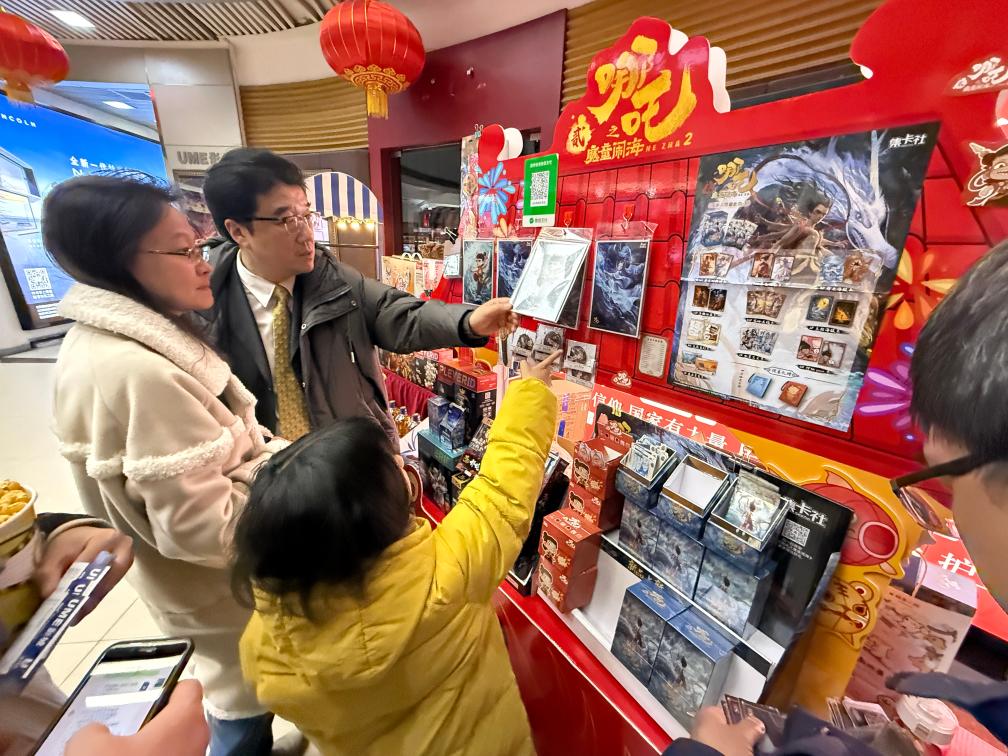 2月14日晚,在北京市海淀區(qū)的UME國際影城(華星店),家長帶著孩子挑選電影紀(jì)念品。新華社記者 才揚(yáng) 攝