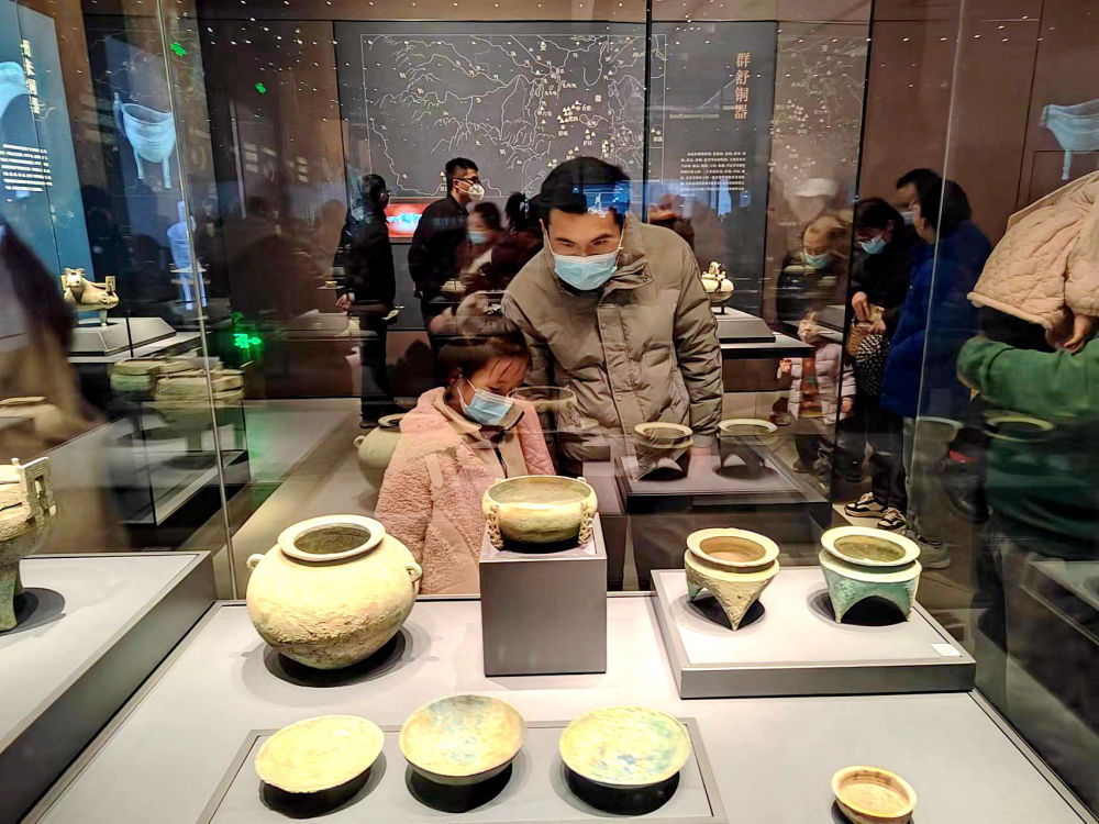 踏上館內玻璃棧道,仿若一步千年。腳下戰(zhàn)國瓦礫層清晰可見,青銅車馬器構件低語著戰(zhàn)國烽煙,“越王者旨于賜劍”見證亂世爭伐,楚金幣布成的“金山”如同暗夜繁星,鄂君啟金節(jié)上篆刻著中國最早的關稅密碼……“我們不做‘百科全書’,只講好本土故事?!卑不粘幕┪镳^副館長常遠霞告訴記者,去年旅游高峰期這里日均接待游客超2萬人。