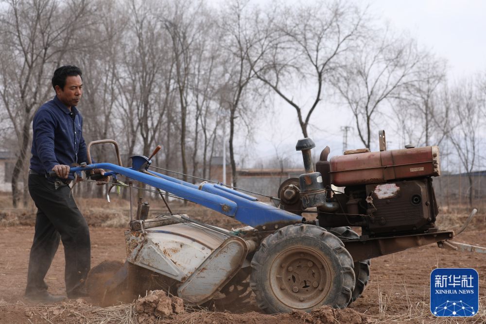 2月19日,在青海省海東市民和回族土族自治縣中川鄉(xiāng)光明村,村民操作農(nóng)機(jī)在田間作業(yè)。