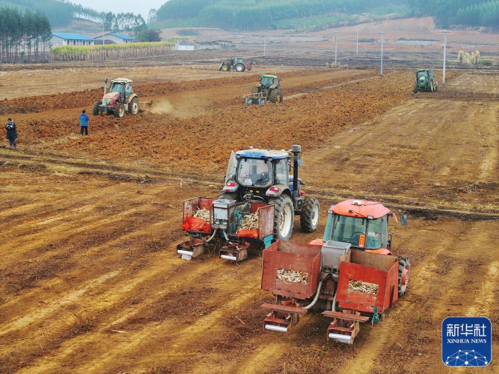2月19日,在廣西來賓市興賓區(qū)鳳凰鎮(zhèn)國家現(xiàn)代農(nóng)業(yè)產(chǎn)業(yè)園黃安優(yōu)質(zhì)“雙高”糖料蔗基地,農(nóng)民駕駛農(nóng)機(jī)在田間作業(yè)(無人機(jī)照片)。