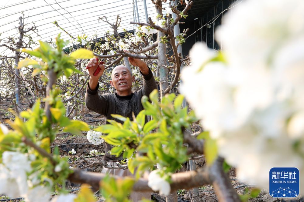2月18日,在山東省濱州市博興縣呂藝鎮(zhèn)高渡村,農(nóng)民在管護(hù)櫻桃樹。