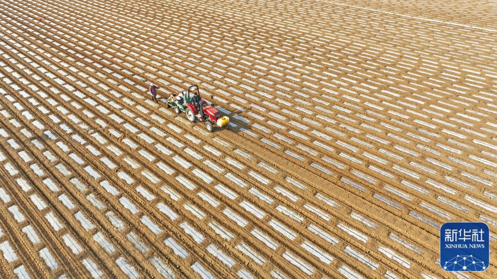 2月18日,在山東省臨沂市郯城縣郯城街道一處蔬菜種植基地,農(nóng)民使用農(nóng)機(jī)播種“訂單土豆”(無人機(jī)照片)。