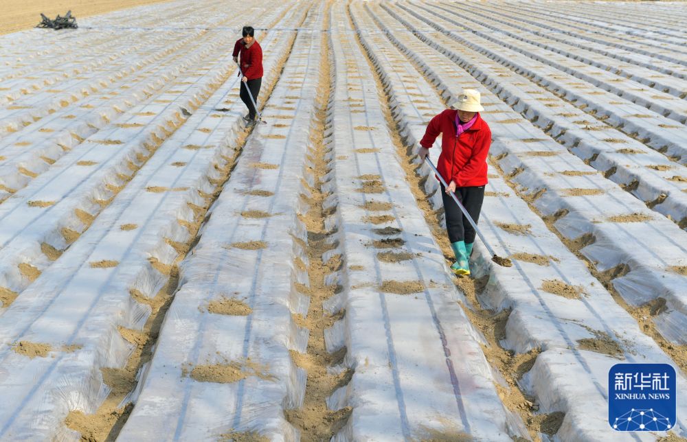 2月18日,在河南省商丘市夏邑縣李集鎮(zhèn)李中村紅高粱家庭農(nóng)場(chǎng),村民為田間鋪設(shè)的地膜覆土加固。