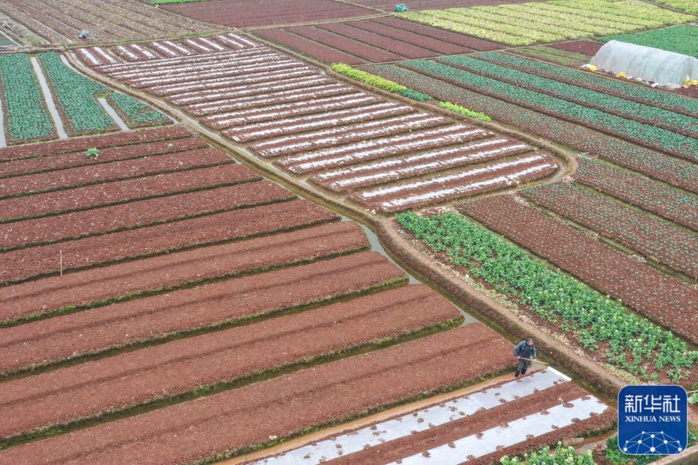 2月18日,在湖南省衡陽縣西渡鎮(zhèn)振興村,農(nóng)民在給剛種植的蔬菜覆膜(無人機(jī)照片)。