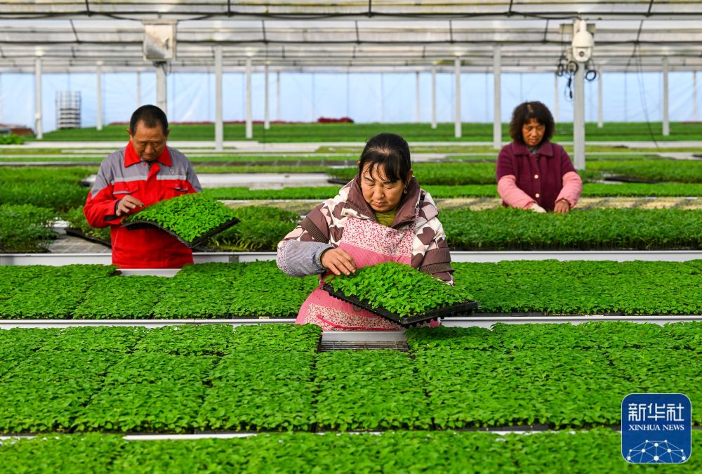2月18日,在浙江省寧波市鎮(zhèn)海區(qū)九龍湖鎮(zhèn)種苗培育基地,工作人員在管護(hù)菜苗。