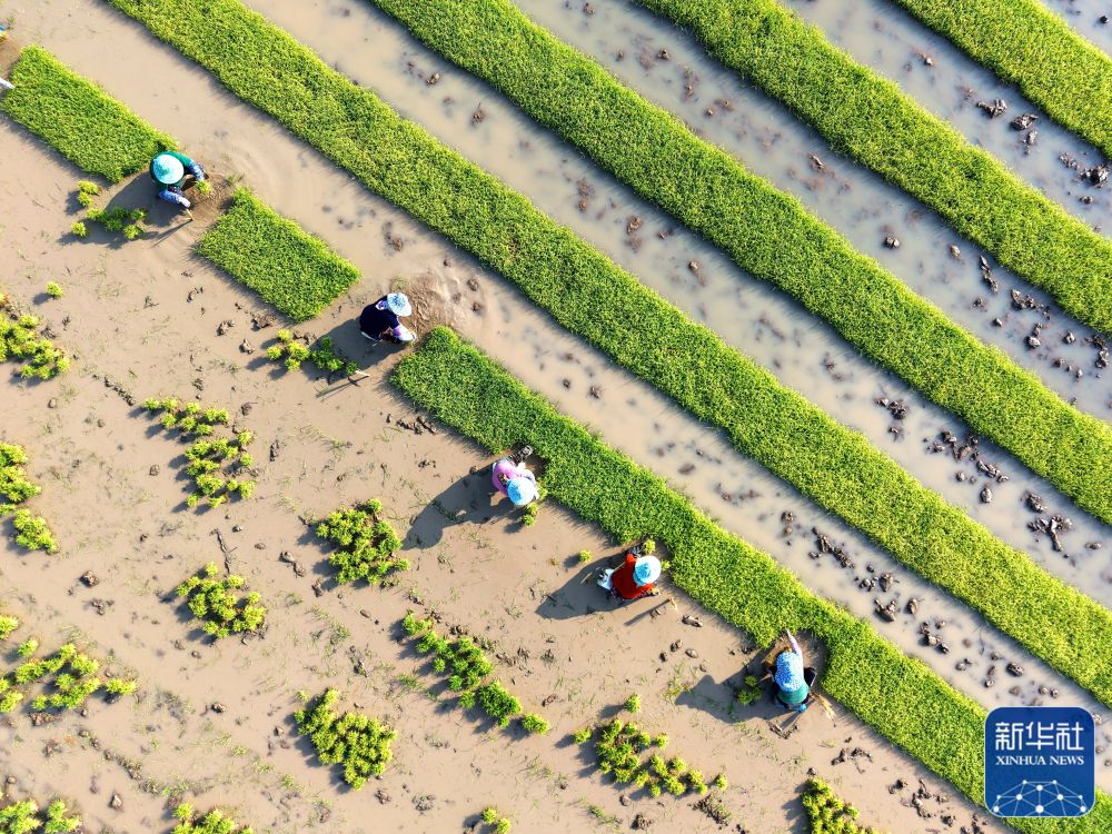 2月18日,在云南省西雙版納州勐??h勐遮鎮(zhèn)曼拉村,農(nóng)民在田間起秧(無人機(jī)照片)。