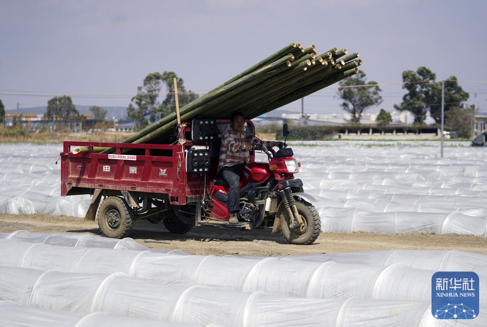 2月19日,在云南省紅河州個(gè)舊市大屯街道,農(nóng)戶運(yùn)送覆膜物資。