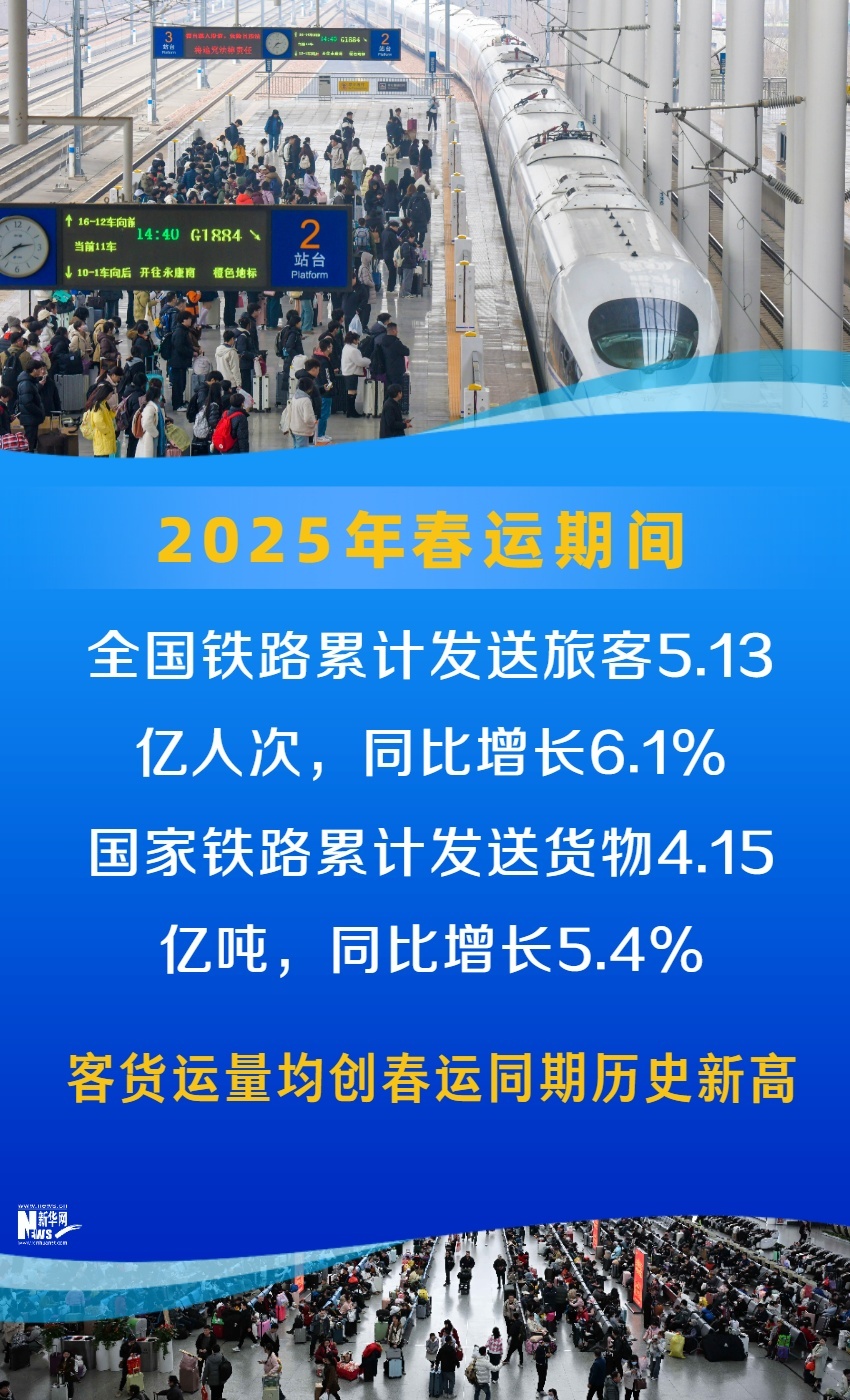 為期40天的2025年鐵路春運圓滿收官。春運期間,全國鐵路累計發(fā)送旅客5.13億人次,同比增長6.1%,國家鐵路累計發(fā)送貨物4.15億噸,同比增長5.4%,客貨運量均創(chuàng)春運同期歷史新高。