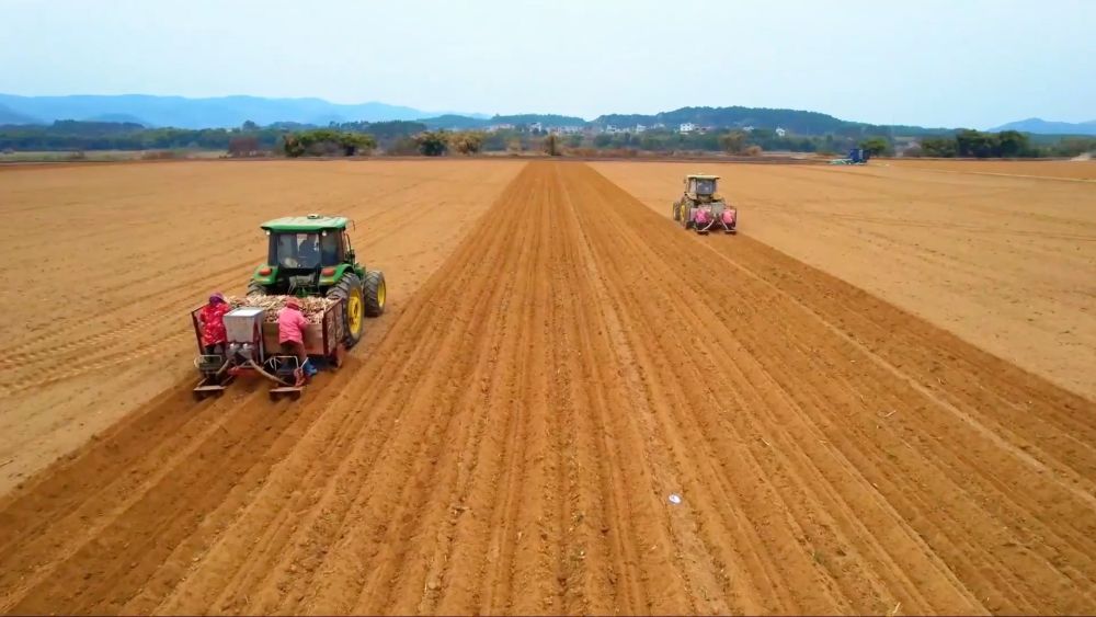 2月19日,在廣西來(lái)賓市興賓區(qū)鳳凰鎮(zhèn)國(guó)家現(xiàn)代農(nóng)業(yè)產(chǎn)業(yè)園黃安優(yōu)質(zhì)“雙高”糖料蔗基地,七臺(tái)大型拖拉機(jī)、甘蔗種植機(jī)并列同步作業(yè),蔗農(nóng)有條不紊地往入口糟插入蔗苗,機(jī)器自動(dòng)完成植苗、蓋膜、覆土工作,不到15分鐘,兩壟長(zhǎng)約200米的甘蔗全部種植完畢。