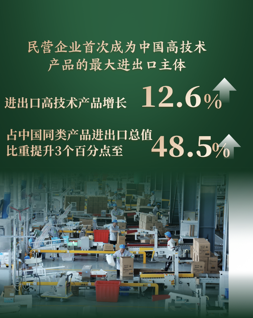 民營(yíng)企業(yè)首次成為中國(guó)高技術(shù)產(chǎn)品的最大進(jìn)出口主體,進(jìn)出口高技術(shù)產(chǎn)品增長(zhǎng)12.6%,占中國(guó)同類產(chǎn)品進(jìn)出口總值比重提升3個(gè)百分點(diǎn)至48.5%。