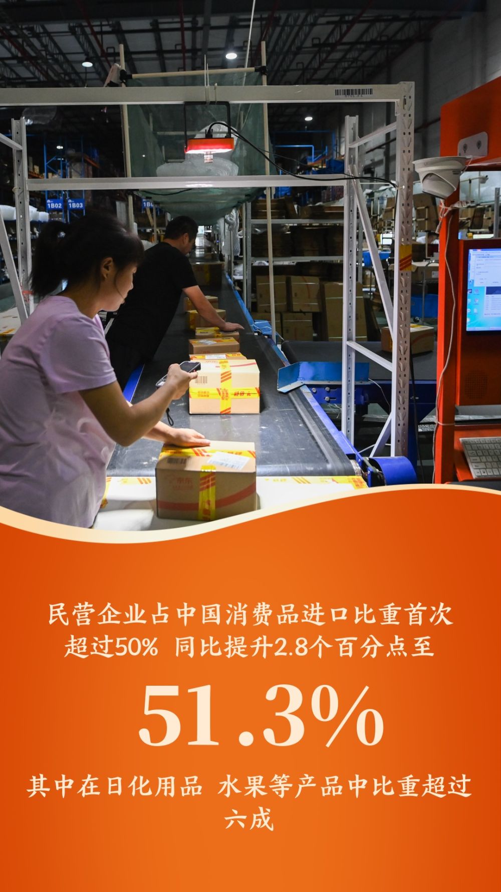 民營(yíng)企業(yè)占我國(guó)消費(fèi)品進(jìn)口比重首次超過50%,同比提升2.8個(gè)百分點(diǎn)至51.3%,其中在日化用品、水果等產(chǎn)品中比重超過六成。